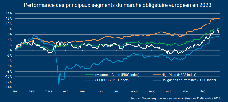 L’an dernier, tous les segments du marché obligataire européen ont enregistré des performances positives. Le segment High Yield a réalisé le parcours le plus solide, avec une progression de 12,08% en moyenne. Le segment Investment Grade a quant à lui progressé de 8,01% et les obligations souveraines de 6,71%. Le segment des AT1 (dettes subordonnées financières) a quant à lui progressé de 5,32%, effaçant totalement sa chute du mois de mars liée aux difficultés de Credit Suisse.