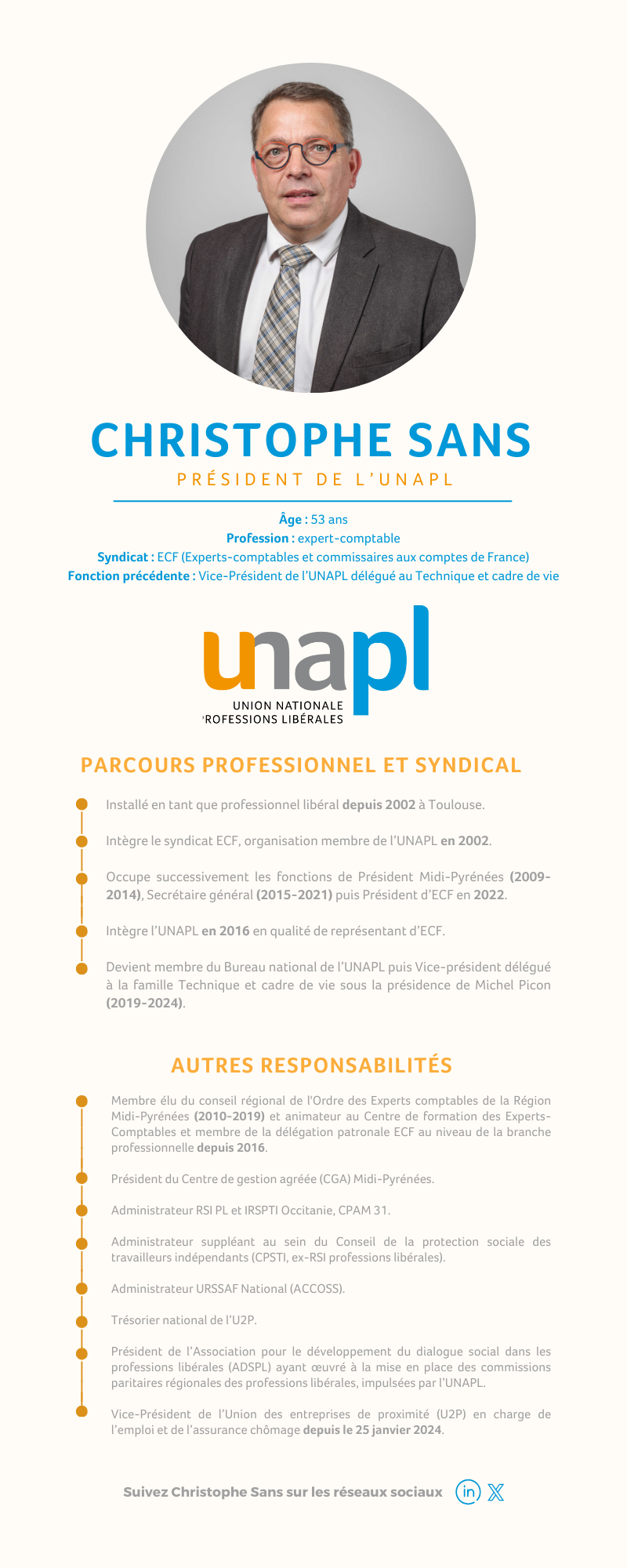 Christophe Sans, Président de l’UNAPL : « Je remercie les organisations membres de l’UNAPL qui m’ont accordé leur confiance. Mon action s’inscrit naturellement dans la continuité des travaux déjà engagés au service de l’ensemble de toutes les professions libérales. Nous sommes déjà au travail, avec les équipes de l’UNAPL, pour défendre les professions libérales et les accompagner dans leurs transformations. Je compte inscrire l’UNAPL comme une force de proposition dans tous les débats qui impactent notre secteur professionnel. »
