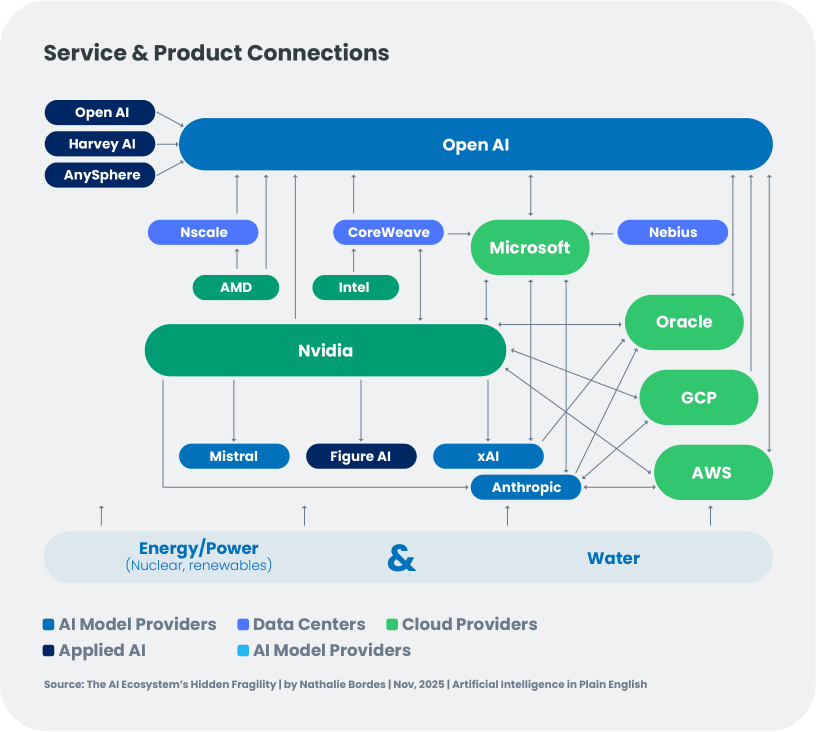 L’interdépendance au sein de l’écosystème de l’IA augmente également. Les entreprises sont de plus en plus liées par des investissements communs, des garanties de dette et des partenariats stratégiques complexes. Bien que cette interconnexion soit propice à l’innovation, elle crée également de nouveaux points de fragilité : en cas de chute d’un acteur majeur, le choc risque de se répercuter sur les fournisseurs, les clients et les investisseurs.