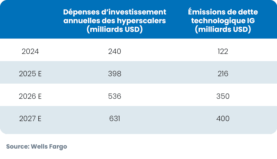 Les hyperscalers américains ont émis une vague d’obligations de taille record pour soutenir l’expansion de leurs infrastructures. Si des bilans solides ont jusqu’ici soutenu la demande, l’environnement évolue : des coupons plus élevés, des performances plus faibles sur le marché secondaire et un élargissement des spreads reflètent les inquiétudes des investisseurs face à la hausse de l’endettement et aux plans de dépenses pluriannuels. Les émissions cumulées ont déjà dépassé les 120 milliards de dollars.[7].