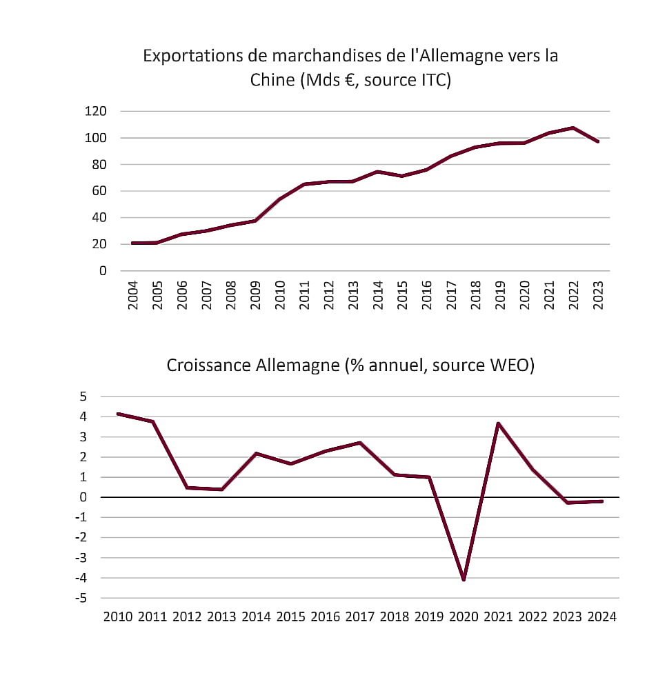 – La baisse des exportations vers la Chine a pénalisé la croissance allemande. L’Allemagne a adopté  une stratégie fondée sur les exportations, notamment à destination des pays émergents en forte  croissance. Par exemple, les exportations de marchandises de l’Allemagne vers la Chine sont passées de  20 milliards d’euros en 2004, à plus de 100 milliards d’euros en 2022, avant de retomber à 97 milliards  d’euros en 2023.