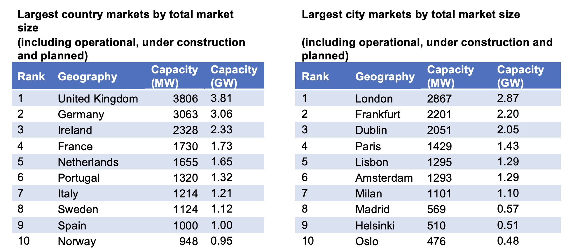 Le rapport confirme la domination continue des marchés FLAPD (Francfort, Londres, Amsterdam, Paris et Dublin), rejoints par Milan. Ces six marchés « moteurs » représentent plus de 45 % de la capacité opérationnelle et près de la moitié du pipeline de développement régional. Londres reste le plus grand marché EMEA, avec 1 189 mégawatts (MW) opérationnels et 1 678 MW supplémentaires en projet.