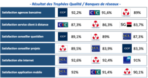 CCF rafle, pour sa part, 3 Trophées. L’ex-HSBC bénéficie du meilleur taux de satisfaction sur l’agence bancaire, qui a beaucoup progressé cette année, et sur le conseiller bancaire du quotidien.