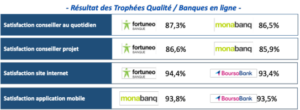 Fortuneo affiche le meilleur score de satisfaction sur le site internet et les conseillers projet et vie quotidienne, Monabanq bénéficie quant à elle de la meilleure satisfaction de l’ensemble des banques en ligne sur l’application mobile.