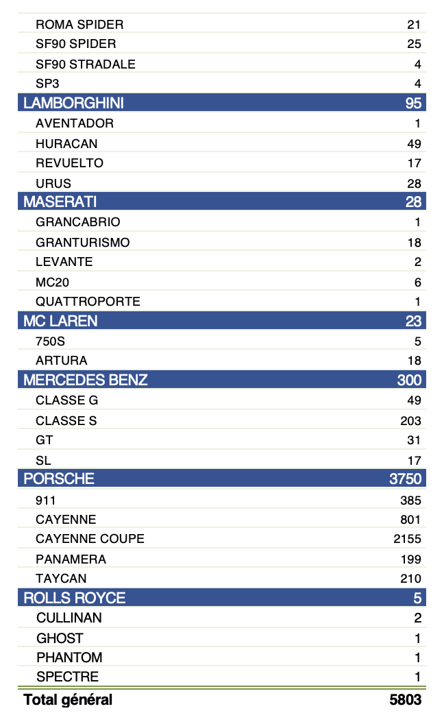 Les marques italiennes continuent de séduire les passionnés de supercars. Ferrari enregistre 246 exemplaires vendu, avec une forte demande pour le modèle 296 (135 immat.) et le SUV Purosangue (46 immat.). De son côté, Lamborghini comptabilise 95 immatriculations, avec le modèle Huracán dominant les ventes (49 unités), suivi du tout nouveau Revuelto (17 immat.), qui rencontre déjà un succès notable et le URUS (28 exemplaires vendus).