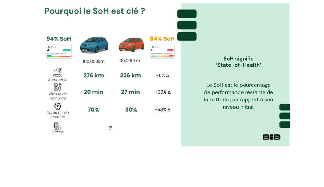 ● l’autre, avec un SoH de 84 %, n’offre plus que 30 % de vie utile, des recharges plus lentes et une durée de vie résiduelle nettement plus courte. Et pourtant, sur le marché, ces deux véhicules sont souvent proposés au même prix, alors même que la batterie représente jusqu’à 40 % du prix du véhicule ! Sur 20 000 véhicules électriques analysés, la donnée le prouve.